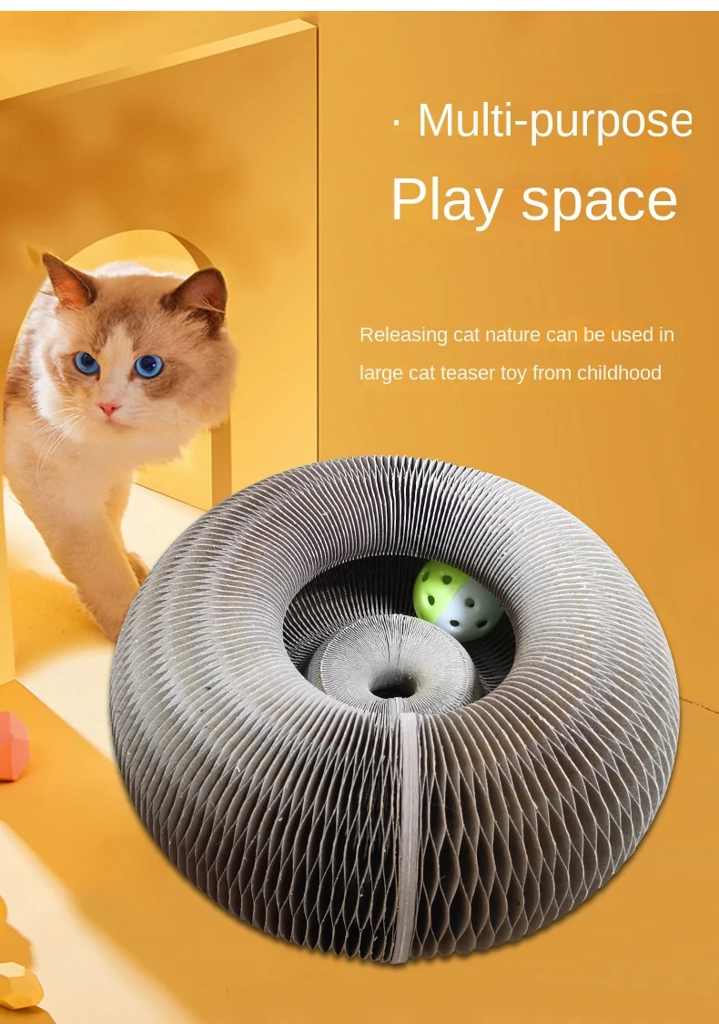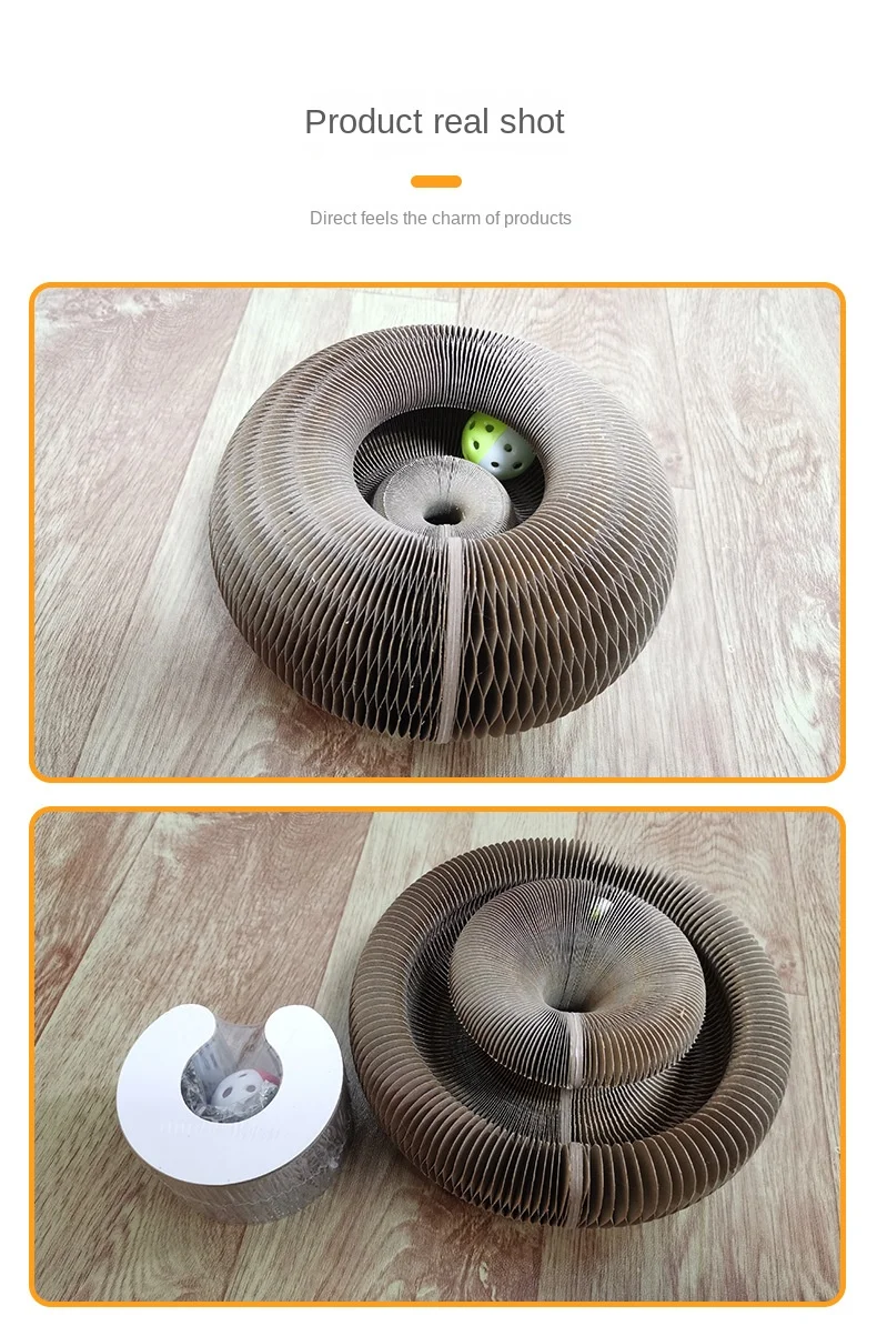 3. The cat scratcher has a channel with a small ball and your cat can nudge with its nose or shove with its paw. Cat toy balls do not pull out easily, the ball will roll around the track, keeping your cats occupied and entertained.